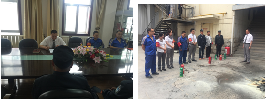 10:30時安全員和義務消防隊員們開始進行現場滅火演練,通過演習,大家掌握了滅火器和消防栓的使用方法。
