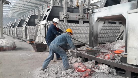 圖為:工投公司電解一車間當班人員在打撈殘極塊