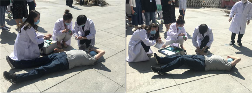 在模擬火災救援現場中發現被困人員,由應急救援隊將被困人員從火場中救出并帶至安全區,由醫療救護組對傷員進行救治及轉移。