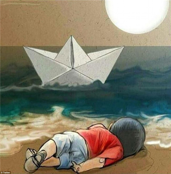 事情發生后,人們紛紛在網上以漫畫哀悼小Aylan。有像"上帝會在你左右的,小天使"這樣的傷感,也有對難民危機的反思和對戰爭的批判。