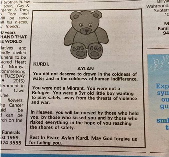 在澳大利亞,還有人在9月4日的《悉尼先驅晨報》上為小Aylan發了份訃告。